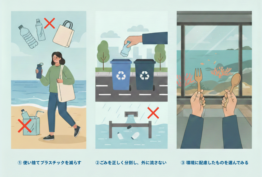 ペットボトルやレジ袋、ストローなど、一度きりで捨ててしまうものを減らすことは、海に流れ出るプラスチックごみを減らすことにつながります。
